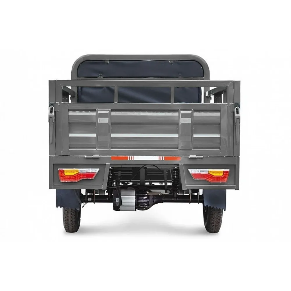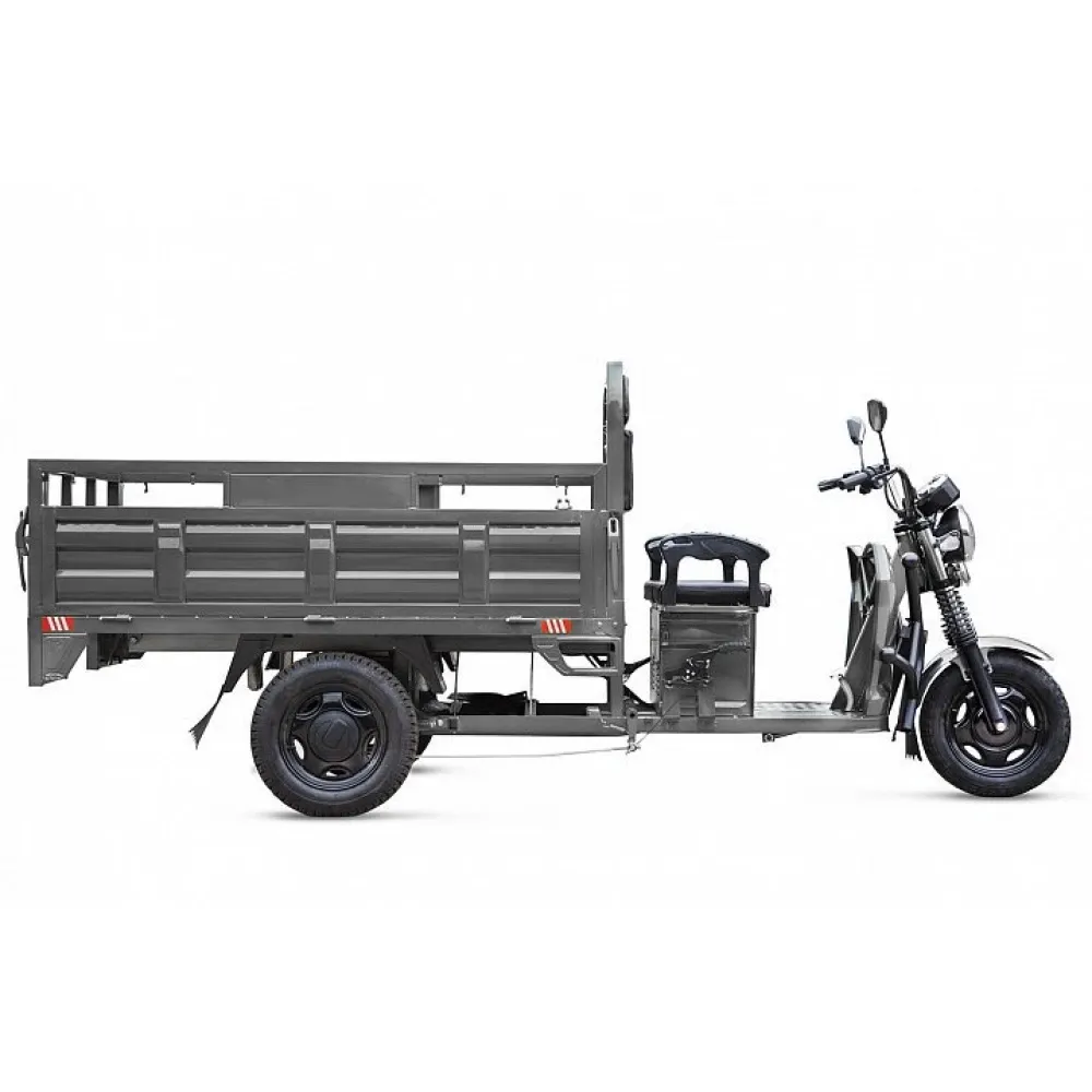 Элетротрицикл рассчитан на водителя с пассажиром, оснащен мягким сиденьем, повторяющим анатомические части тела, снимающую усталость при длительной дороге. Вместительный кузов представлен размерами 1800 x 1250 x 475 мм (Д х Ш х В), имеет откидные борты, что удобно для сельских жителей, транспортирующих сено с полей.