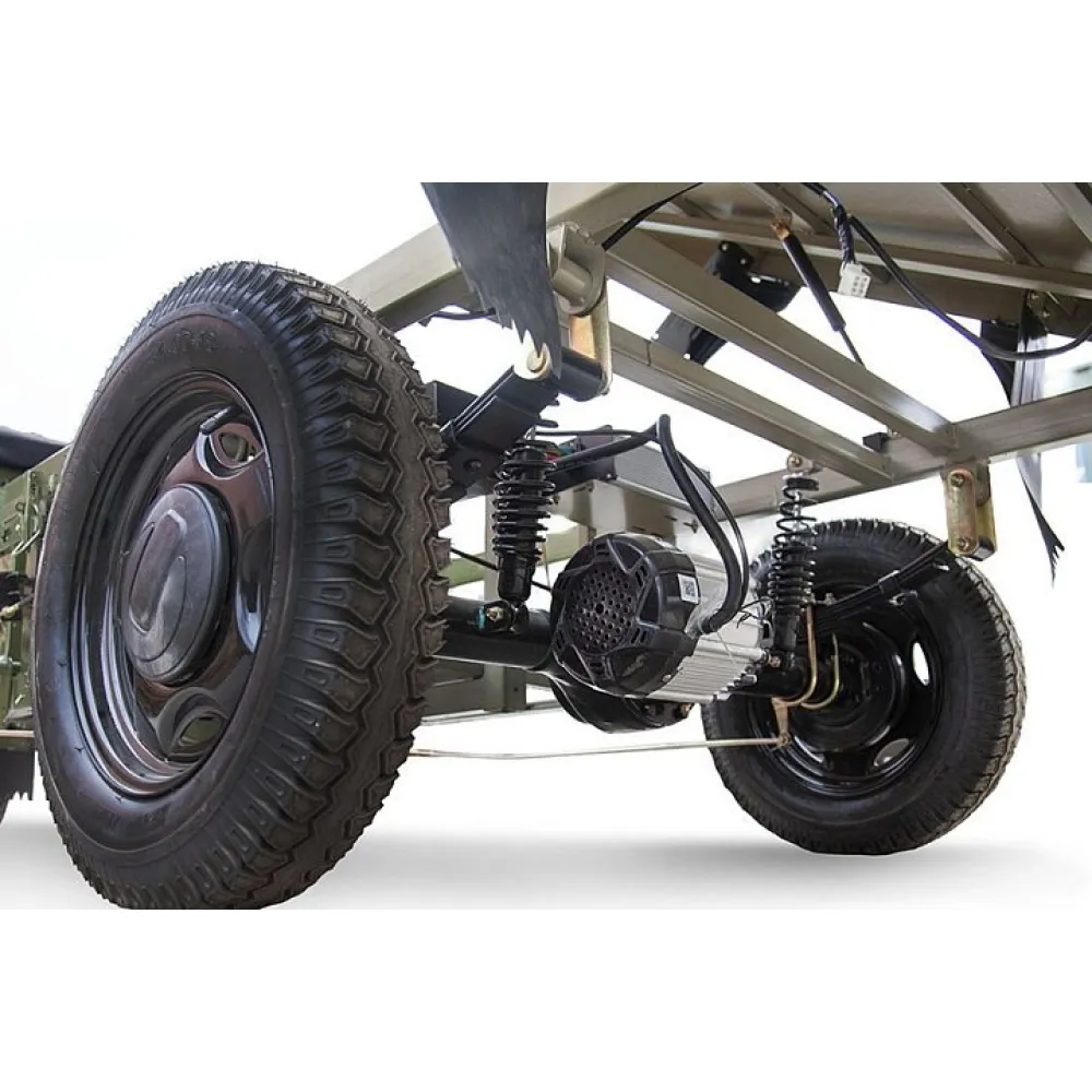 Вместительный кузов представлен размерами 1800 x 1250 x 475 мм (Д х Ш х В), имеет откидные борты, благодаря которым техника может использоваться на стройке и в сельском хозяйстве. Электротрицикл показывает высокую эффективность при выполнении погрузочно-разгрузочных работ.