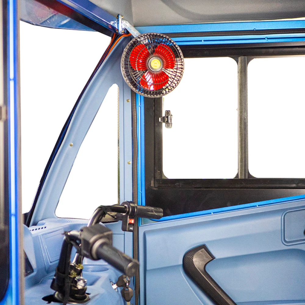 Усиленная конструкция рамы, барабанный тормоз и светодиодная передняя фара гарантируют безопасное вождение в любых условиях. Крытая герметичная кабина с открывающимися с двух сторон дверями обеспечивает защиту от непогоды, а механизм стеклоочистителя поддерживает чистоту лобового стекла.
