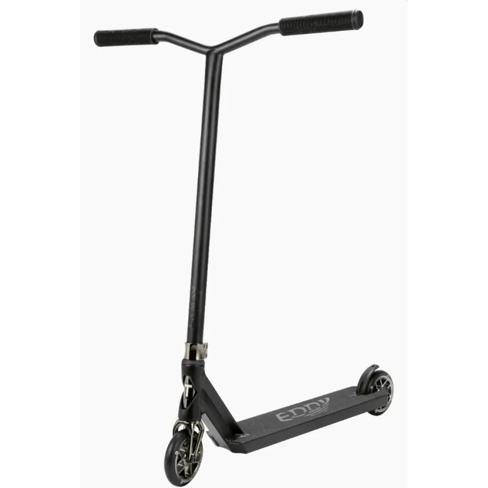 Новейшая алюминиевая вилка IHC-компрессии оснащена зажимом из двух болтов соединяющих с рулем из закалённой "хромолевой" стали в диаметре 31,8 мм в классической форме «крылья чайки». Диск у колеса из алюминия средней жесткости 88 A, диаметр 110 мм и ширина 24 мм выполнены из высочайшего по качеству полиуретана с технологией "Super High Rebound". Благодаря технологии отскок резкий и высокий. Модель выпускается в черном окрасе есть с вариацией зажима вместе с вилкой «нео-хром» на анти скользящем покрытии есть фирменный дизайнерский элемент отображающий название модели, так-же на абортной стороне деки есть надпись. Eddy очень стильный и качественно выполненный помошник, инженерные решения очень прогрессивны и смелы. Данная модель преставлена в полностью черном исполнении.