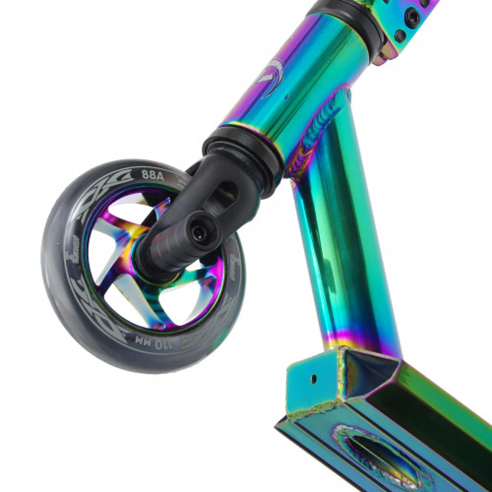 Самокат трюковый Haevner KLINGER неохром – надежная техника с ярким выделяющимся дизайном. Маневренность и плавность движения гарантируются небольшим весом 3,9 кг и кассетного типа рулевой стойкой. Ступица и алюминиевая дека 110*500 мм (закалка Т6) со скошенными дропами изготовлены из Алюминия 6061. Пользователи массой не более 100 кг смогут выполнять трюки на рампах и специально оборудованных дорожках, благодаря колесам 110 мм (для этого увеличена жесткость до 88 А).